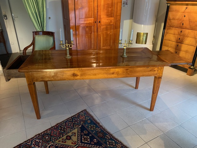 um 1800, massiv Kirschbaum, Brotbrett-Verlängerung und große Schublade. Tische in diesem Format sind selten und sehr beliebt!