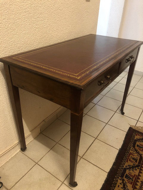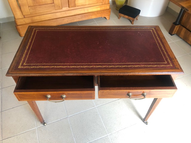 Small desk, light mahogany, embossed leather top, 2 drawers, on brass castors, manufacturer's logo in brass on the inside, England around 1900